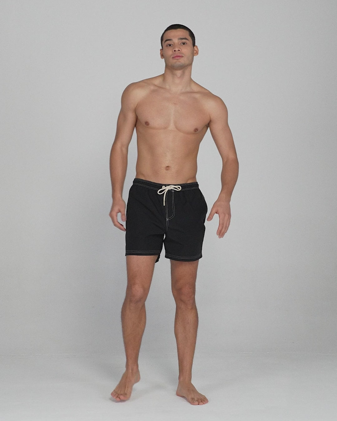 Solid color swim shorts made from a recycled, lightweight, quick-drying shell with a unique crinkled texture. They are traced with ecru stitching, adding a refined touch of detail. Designed with a straight-leg fit, these shorts feature reinforced side pockets, built-in mesh briefs for added support and comfort and elasticated drawstring waistband for a secure and adjustable fit.